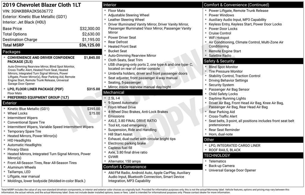 This is one impressive car. I purchased the Chevrolet Blazer with 6 cylinder engine. It has everything I want. Great acceleration, Great styling, Quiet engine, Well equiped, I really like the turn signals in the mirrors, push button start, blind spot monitoring, cross traffic monitoring, Continental Tires, and easy pairing of cell phone. I did not get AWD or GPS. There is nothing, I would change and for the price, a great deal to boot. You won't be disappointed.… - 5.0
